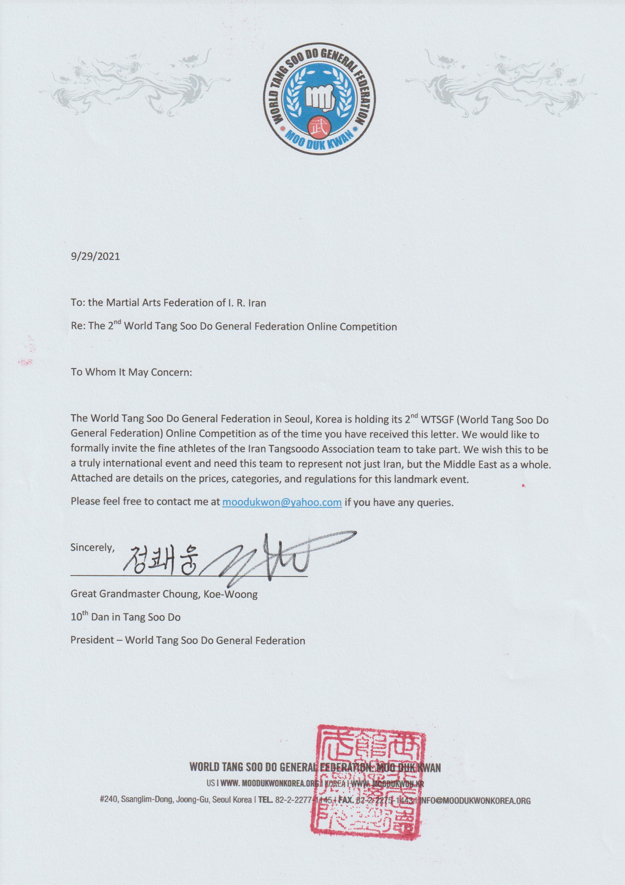 فدراسیون جهانی تانگ سودو مستقر در کره جنوبی طی دعوت نامه رسمی به فدراسیون انجمن های ورزشهای رزمی از تیم منتخب تانگ سودو ایران جهت حضور در دومین دوره مسابقات آنلاین جهانی دعوت کرد تا در این رویداد جهانی در کنار دیگر کشور حضور داشته باشد. شایان ذکر است کشور ایران بعنوان یکی از قطب های تانگ سودو در قاره آسیا با حضور استاد رحیم سهراب زاده نماینده رسمی فدراسیون جهانی و ریاست فدراسیون آسیایی یکی از کشورهای مطرح در این مسابقات است که در این دوره حضور دارد و مربیان و قهرمانان ارزنده تانگ سودو ایران در اردوی تمرینی تحت نظارت استاد سهراب زاده و مربیان ارشد تانگ سودو کشور در حال تمرین جهت حضور در این رویداد جهانی هستند.